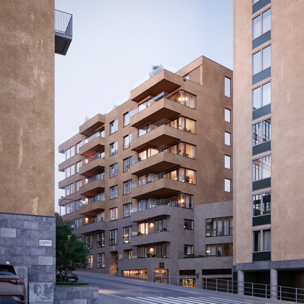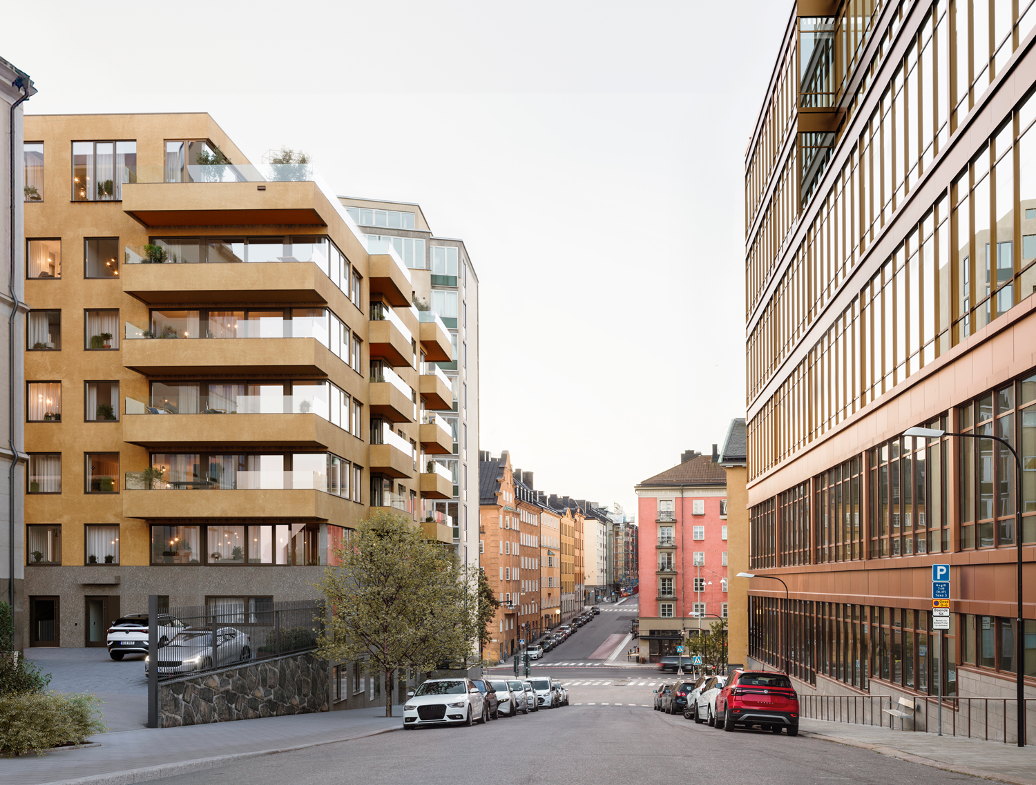 Projektet håller en genomgående hög kvalitetsnivå vad gäller materialval, inredning, utrustning och ytskikt. I entreprenaden ingick rivning av befintlig fastighet, bergschakt samt borrning av energihål för bergvärmeanläggning, vilket genomfördes i direkt anslutning till SL:s arbetstunnel under fastigheten.