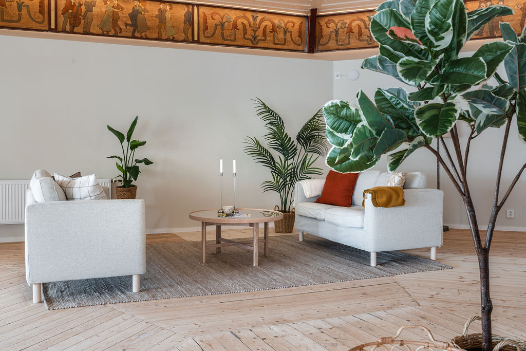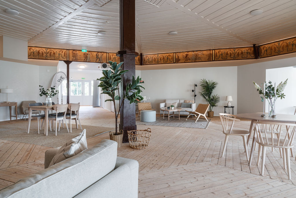 På insidan har vi fyllt byggnaden med en plattform för nytt liv, i mitten finns en stor härlig lounge som har samma åttkantiga form som utsidan där dansen nu kan fortsätta i många generationer. Den målade fresken med dansande människor, som bevarats, har man idelig kontakt med och är dessutom vackert belyst. Känslan i detta rum är minst sagt magisk. Trägolvet är också bevarat med kompletteringar där det varit stora fuktskador.